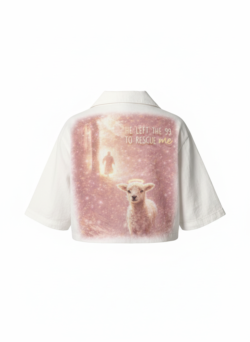 The back design features a radiant, ethereal illustration a glowing pathway, a shepherd figure, and a gentle lamb, symbolizing divine pursuit and unconditional love. The message, “He left the 99 to rescue me,” is delicately printed, serving as both a personal reminder and a bold declaration of faith.